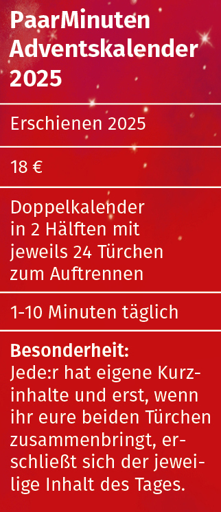 Unsere Adventskalender begleiten euch durch den Advent und stärken eure Liebe. Ihr schenkt euch täglich etwas Zeit nur für euch als Paar – ganz egal, wie trubelig es im Dezember ist.