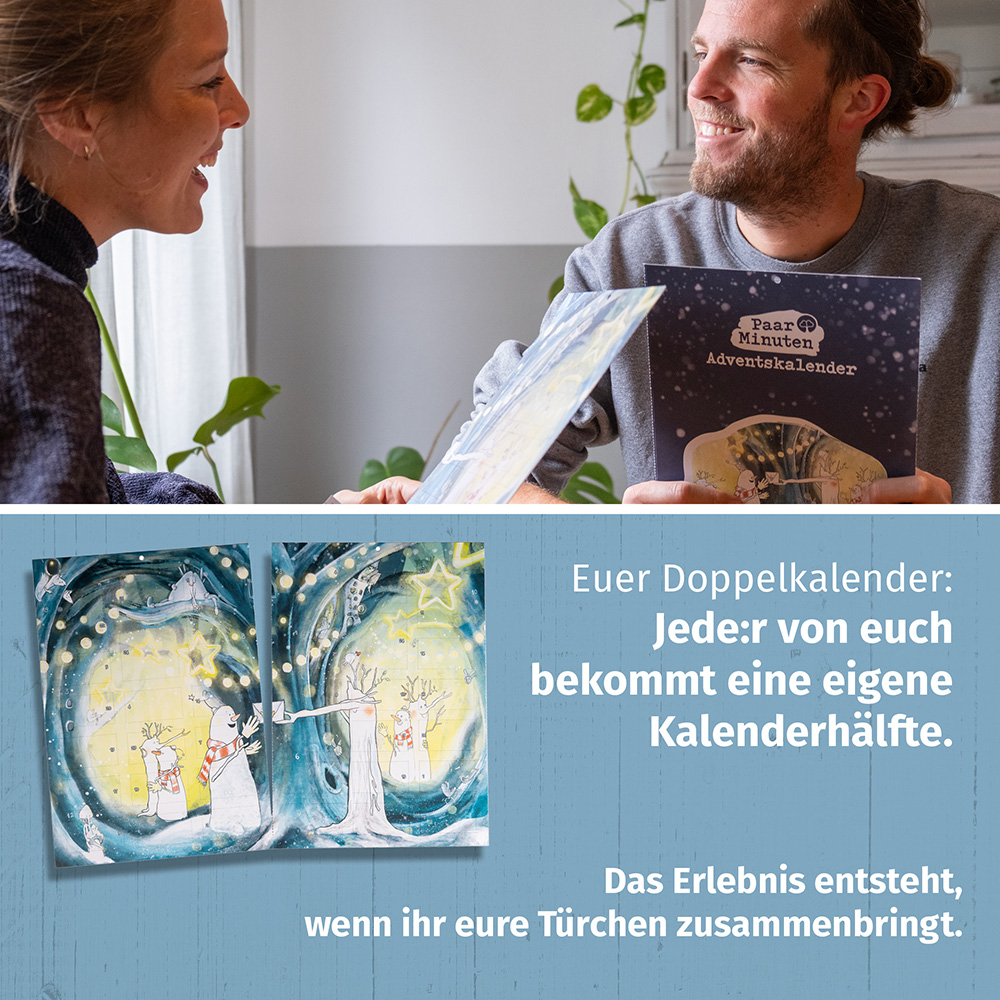 Das Wort „Doppelkalender“ beschreibt unser Adventskalenderformat, bei dem ihr einen zusammenhängenden Adventskalender bekommt, den ihr in 2 Hälften teilen könnt. Jede:r von euch bekommt eine eigene Hälfte mit Türchen zum Öffnen. Eure Inhalte funktionieren nur gemeinsam und sind täglich aufeinander abgestimmt. Bei uns im Paarzeit-Team sagen wir gerne: „Der PaarMinuten Adventskalender ist mehr als die Summe seiner Teile.“