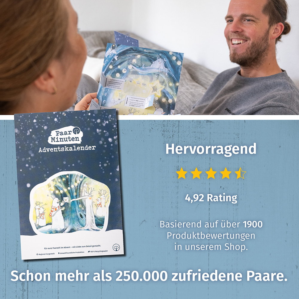 Selbst wenn ihr zwischen den ganzen Feiern im Advent oder als viel beschäftigte Eltern kaum Zeit für euch als Paar findet, habt ihr mit dem PaarMinuten Adventskalender täglich die Chance, auf ein bisschen Zeit zu zweit – abseits von Alltagsgesprächen.