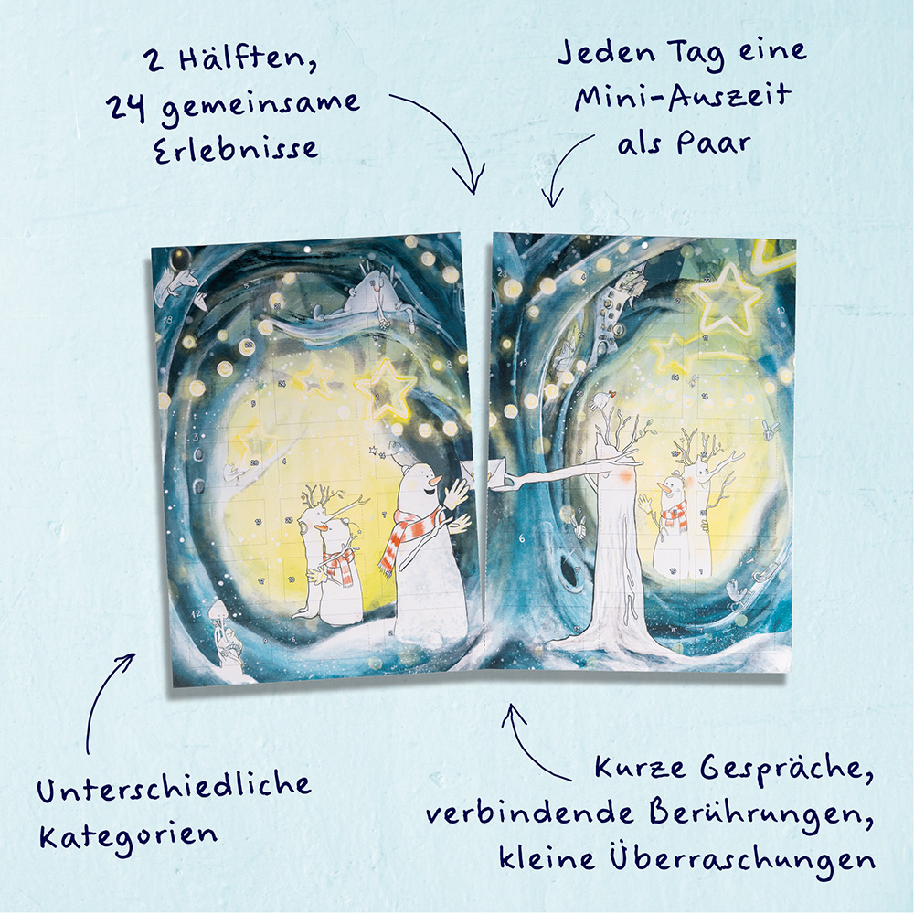 Inhaltlich erwarten euch in diesem Doppelkalender locker-leichte Fragen, Überraschungen, kurze Gesprächsimpulse und kleine Aufgaben. Die Türchen eurer beiden Kalenderhälften sind aufeinander abgestimmt und greifen ineinander. Das lässt Paarinteraktionen mit Überraschungsmomenten und spannenden Unterhaltungen entstehen.