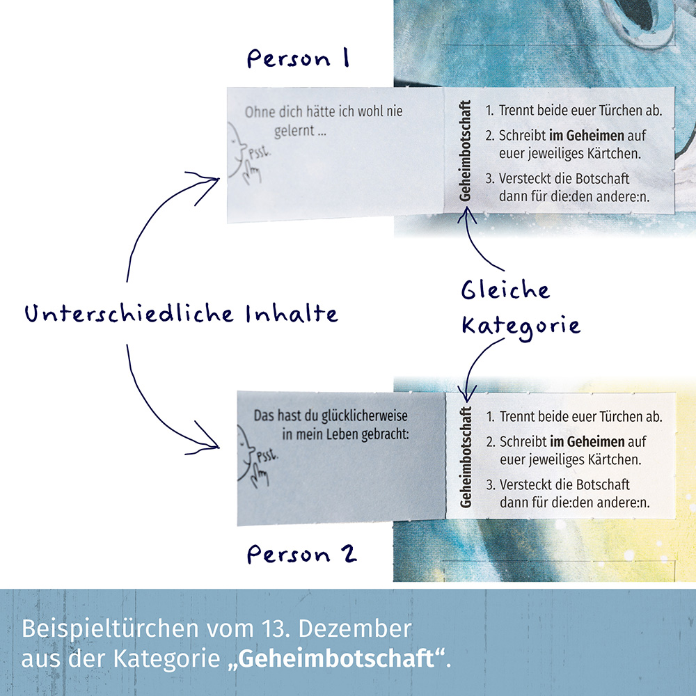 Kategorie „Geheimbotschaft“: Ihr könnt beide euer Türchen abtrennen und ausfüllen, um im Anschluss eine kleine Geheimbotschaft füreinander zu verstecken. Dabei habt ihr unterschiedliche Satzanfänge zum Vervollständigen. Hier siehst du wieder den Inhalt von einem der beiden Kalender: