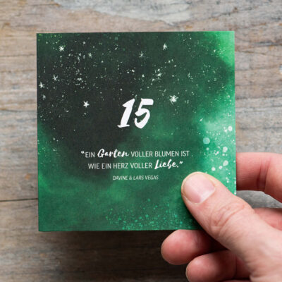 Im besten Fall öffnet ihr natürlich eine Paarzeit-Karte pro Tag, damit ihr euch regelmäßig Zeit füreinander nehmt. Aber wenn das mal nicht klappen sollte, braucht ihr euch keinen Kopf zu machen. Es ist wie mit Schokoladen-Adventskalendern: dann bleibt mehr für später.