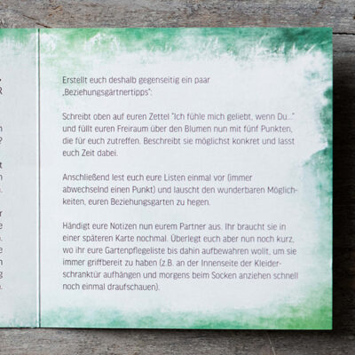 Einige Paare haben uns auch schon erzählt, dass sie sich dann für einen Paarzeit-Abend verabreden, um nacheinander mehrere Karten zu öffnen, für die im Alltagstrubel kein Platz war. Damit könnt ihr euch ganz einfach einen wunderbaren Abend als Paar gestalten.