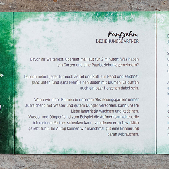 Einige Paare haben uns auch schon erzählt, dass sie sich dann für einen Paarzeit-Abend verabreden, um nacheinander mehrere Karten zu öffnen, für die im Alltagstrubel kein Platz war. Damit könnt ihr euch ganz einfach einen wunderbaren Abend als Paar gestalten.