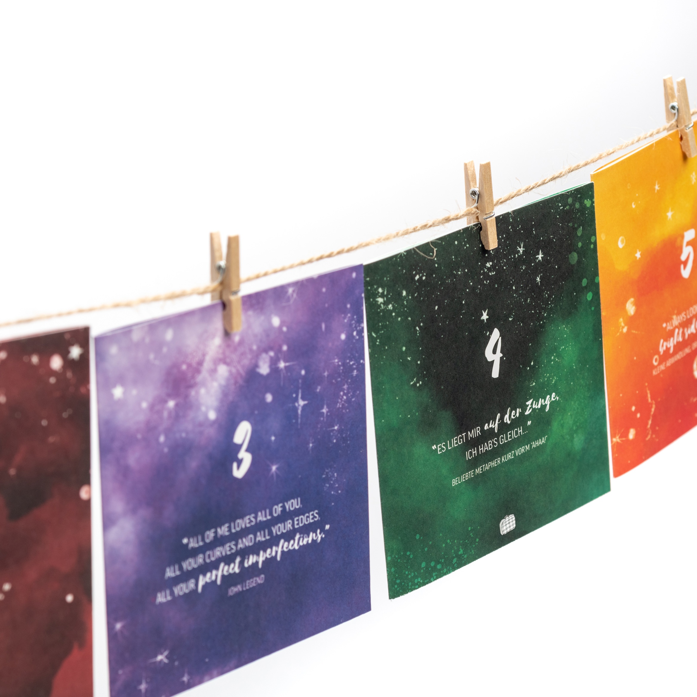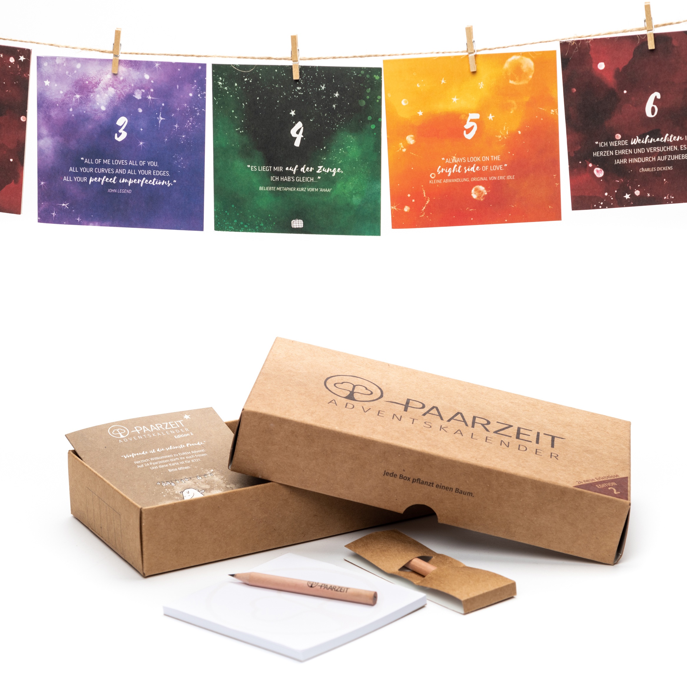 Das Befestigen geht schnell, ist einfach und sieht schön aus. Nutzt die beiliegende Schnur aus nachwachsenden Rohstoffen und die 24 Holzklammern, um die Karten zu befestigen. Ob an der Wand, an der Gardinenstange, am Treppengeländer oder über einem Kamin – in jedem Zuhause lässt sich ein schönes Plätzchen für den Paarzeit Adventskalender finden. So schmückt der Paarzeit Adventskalender euer Zuhause dekorativ und mit wenig Aufwand.